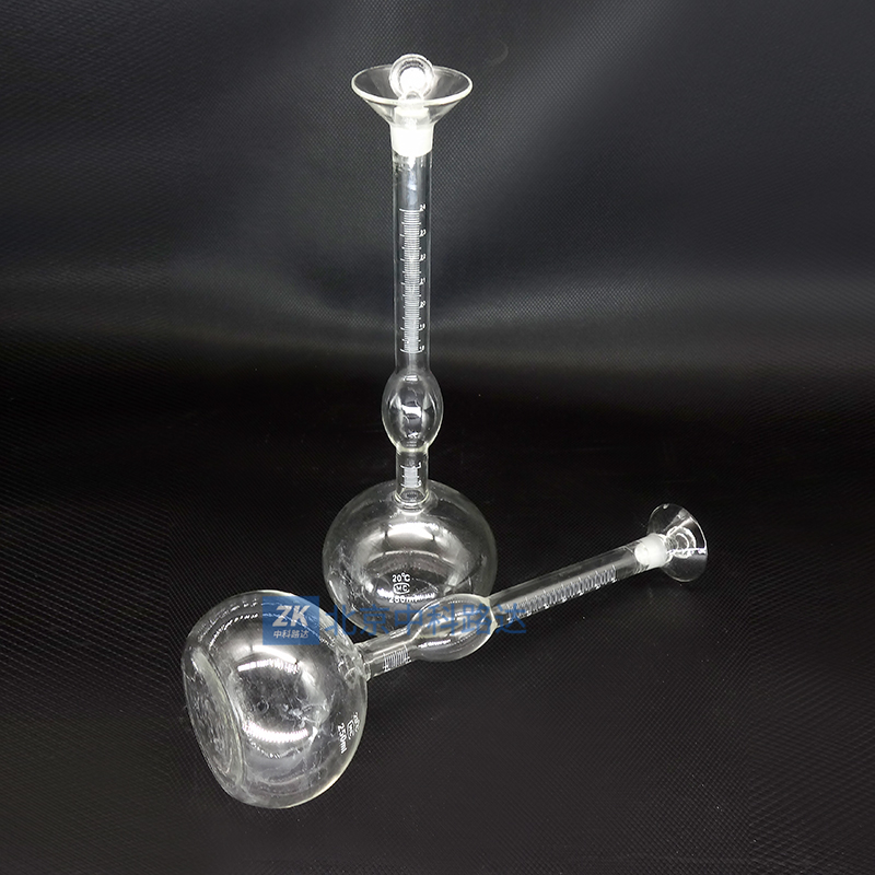 形寬口,具磨砂玻璃塞,在瓶頸的中下部有一長形球,瓶頸刻度容量
