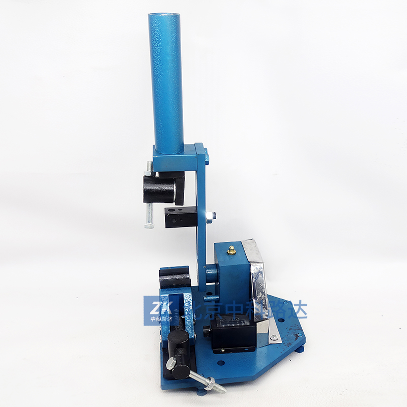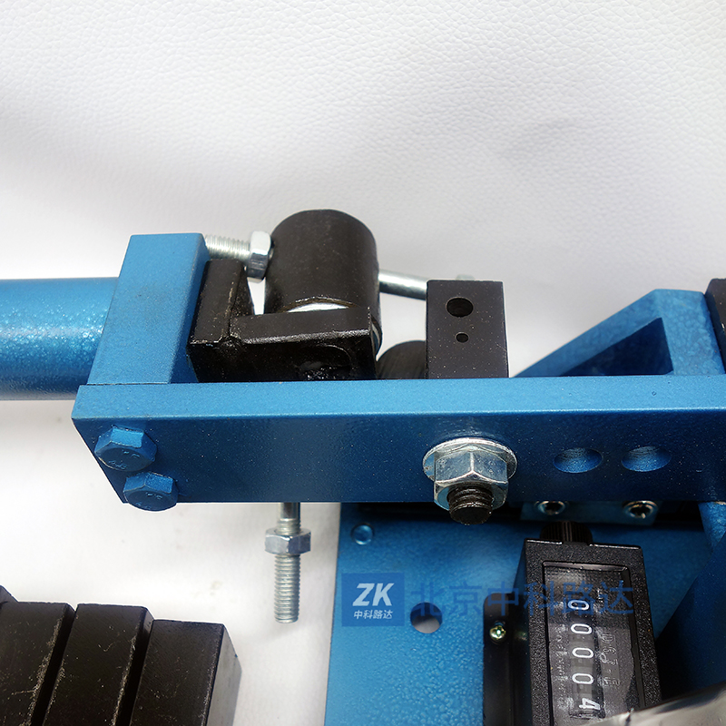 4、將搖臂處于垂直位置,并以此作為試驗的起始狀態(tài)將試樣先穿入兩夾片中底板的孔內(nèi)。然后垂直向上從撥桿的下部穿過撥桿孔,再穿入上夾頭至頂部,轉(zhuǎn)動上夾頭手柄把線材上端夾緊