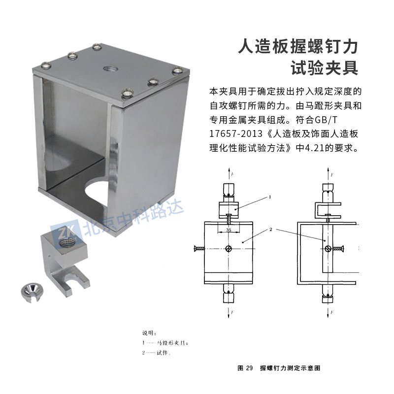 本夾具用于確定拔出擰入規(guī)定深度的自攻螺釘所需的力。由馬蹬形夾具和專用金屬夾具組成。符合GB/T 17657-2013《人造板及飾面人造板理化性能試驗方法》中4.21的要求。