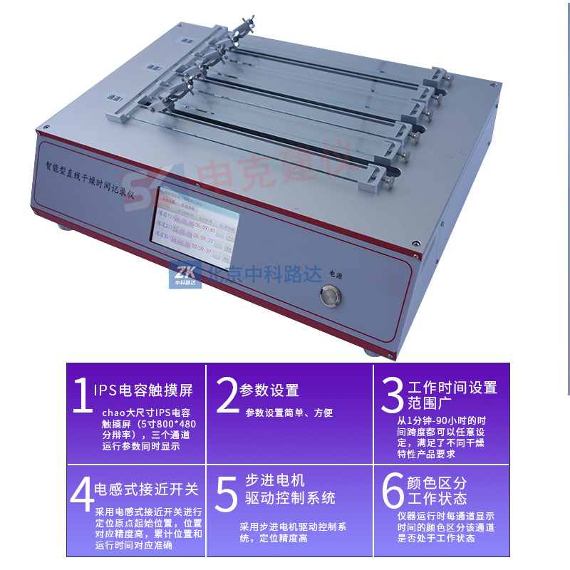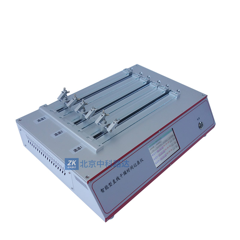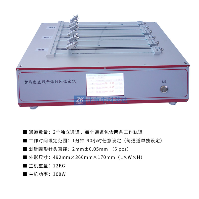 這是一款功能強大的智能型的直線干燥時間記錄儀,可以滿足不同干燥時間特性的樣品的全面分析。帶半球型觸點的劃桿安裝在滑架上。劃桿由滑架帶動,與新涂膜層接觸,由一端開始,在試樣上作縱向移動。可通過儀器的“軌跡查詢”功能查看對應軌跡的各個干燥階段。它有三個可以單獨設定任意運行時間的通道(每個通道有兩條工作軌道),符合ASTM D 5895的標準要求。
