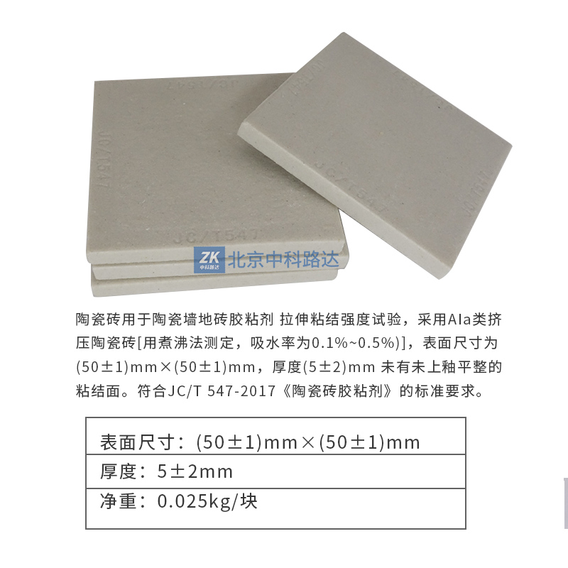 陶瓷磚用于陶瓷墻地磚膠粘劑 拉伸粘結(jié)強度試驗,采用AIa類擠壓陶瓷磚[用煮沸法測定,吸水率為0.1%~0.5%)],表面尺寸為(50±1)mm×(50±1)mm,厚度(5±2)mm 未有未上釉平整的粘結(jié)面。符合JC/T 547-2017《陶瓷磚膠粘劑》的標準要求。