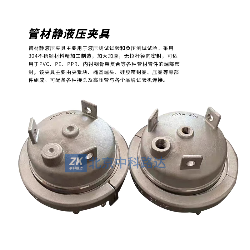 管材靜液壓夾具主要用于液壓測試試驗(yàn)和負(fù)壓測試試驗(yàn)。采用304不銹鋼材料精加工制造,加大加厚,無拉桿徑向密封,可適用于PVC、PE、PPR、內(nèi)襯鋼骨架復(fù)合等各種管材管件的端部密封,該夾具主要由夾緊塊、橢圓端頭、硅膠密封圈、壓圈等零部件組成??膳鋫涓鞣N接頭及高壓管與各個品牌試驗(yàn)機(jī)連接。