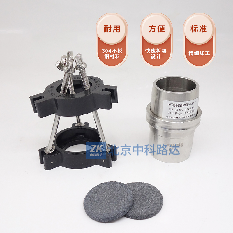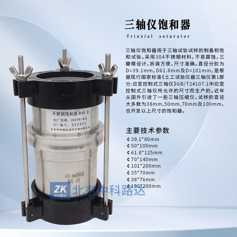 三軸儀飽和器用于三軸試驗(yàn)試樣的制備和飽和試驗(yàn)。采用304不銹鋼材料,不易腐蝕,三模設(shè)計(jì),拆裝方便,尺寸準(zhǔn)確。直徑分別為D=39.1mm,D61.8mm及D=101mm,是根據(jù)現(xiàn)行國家標(biāo)準(zhǔn)《土工試驗(yàn)儀器三軸儀第1部分:應(yīng)變控制式三軸儀》GB/T24107.1中應(yīng)變控制式三軸儀所允許的尺寸而生產(chǎn)的。近年從國外引進(jìn)了一些三軸壓縮儀,試樣的直徑大多數(shù)為38mm,50mm,70mm及100mm,也開了發(fā)以上尺寸的飽和器。