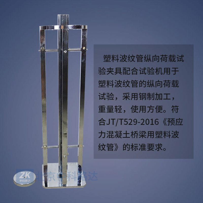 本夾具配合試驗(yàn)機(jī)用于塑料波紋管的縱向荷載試驗(yàn),采購鋁合金加工,重量輕,使用方便。符合JT/T 529-2016《預(yù)應(yīng)力混凝土橋梁用塑料波紋管》的標(biāo)準(zhǔn)要求。