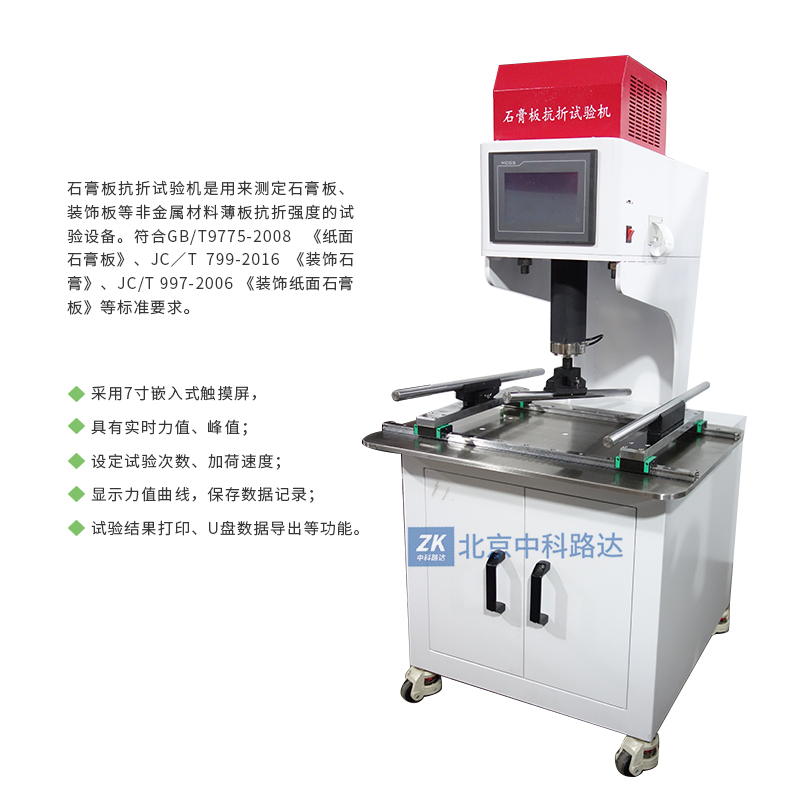 石膏板抗折試驗(yàn)機(jī)是用來測定石膏板、裝飾板等非金屬材料薄板抗折強(qiáng)度的試驗(yàn)設(shè)備。符合GB/T9775-2008 《紙面石膏板》、JC∕T 799-2016 《裝飾石膏》、JC/T 997-2006 《裝飾紙面石膏板》等標(biāo)準(zhǔn)要求。采用7寸嵌入式觸摸屏,具有實(shí)時(shí)力值、峰值;設(shè)定試驗(yàn)次數(shù)、加荷速度;顯示力值曲線,保存數(shù)據(jù)記錄; 試驗(yàn)結(jié)果打印、U盤數(shù)據(jù)導(dǎo)出等功能。