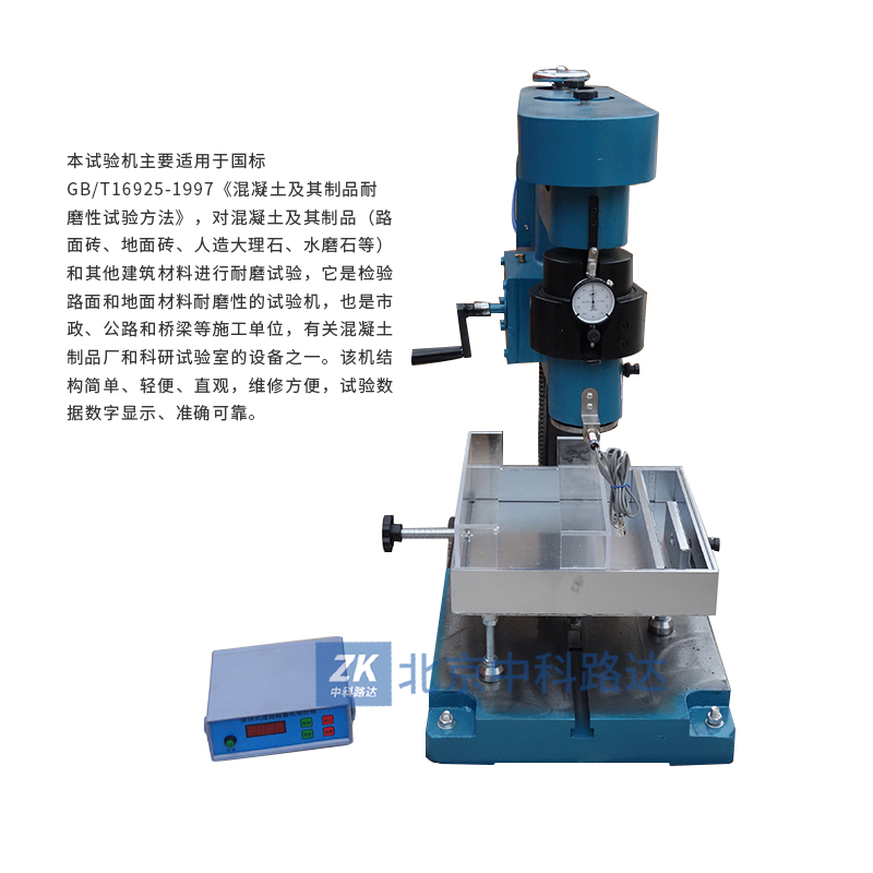 本試驗機主要適用于國標GB/T16925-1997《濕凝土及其制品耐磨性試驗方法》,對混凝土及其制品(路面磚、地面磚、人造大理石、水磨石等)和其他建筑材料進行耐磨試驗,它是檢驗路面和地面材料耐磨性的試驗機,也是市政、公路和橋梁等施工單位,有關混凝土制品廠和科研試驗室的設備之一。該機結構簡單、輕便、直觀,維修方便,試驗數(shù)據(jù)數(shù)字顯示、準確可靠。
