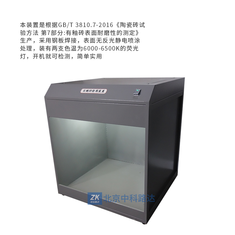 本裝置是根據(jù)GB/T 3810.7-2016《陶瓷磚試驗(yàn)方法 第7部分:有釉磚表面耐磨性的測(cè)定》生產(chǎn),采用鋼板焊接,表面無反光靜電噴涂處理,裝有兩支色溫為6000-6500K的熒光燈,開機(jī)就可檢測(cè),簡(jiǎn)單實(shí)用。