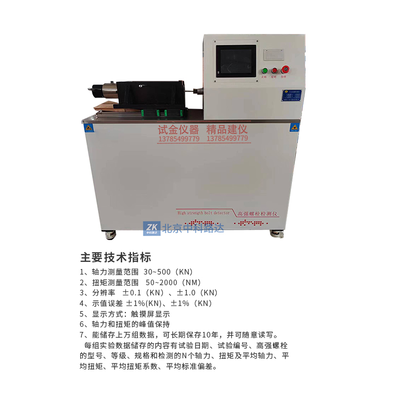 本檢測儀可以對大六角頭高強(qiáng)螺栓連接副(M12、M16、M20、M22、M24、M27、M30)和扭剪型高強(qiáng)螺栓連接副(M16、M20、M24、M27、M30)的軸力、扭矩(或扭矩系數(shù))進(jìn)行自動(dòng)檢測、顯示并打印。