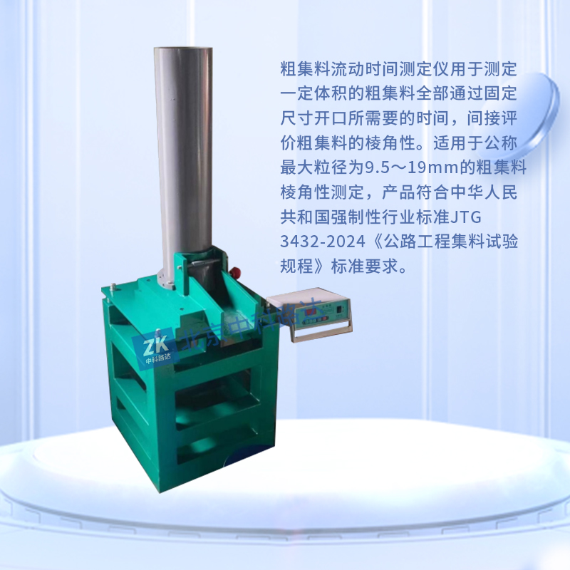粗集料流動時間測定儀用于測定一定體積的粗集料全部通過固定尺寸開口所需要的時間,間接評價粗集料的棱角性。適用于公稱最大粒徑為9.5~19mm的粗集料棱角性測定,產(chǎn)品符合中華人民共和國強制性行業(yè)標準JTG 3432-2024《公路工程集料試驗規(guī)程》標準要求。