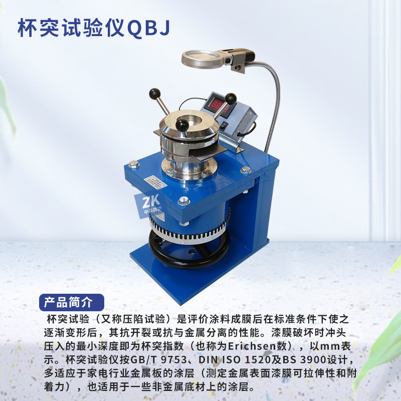 杯突試驗(又稱壓陷試驗)是評價涂料成膜后在標(biāo)準(zhǔn)條件下使之逐漸變形后,其抗開裂或抗與金屬分離的性能。漆膜破壞時沖頭壓入的最小深度即為杯突指數(shù)(也稱為Erichsen數(shù)),以mm表示。杯突試驗儀按GB/T 9753、DIN ISO 1520及BS 3900設(shè)計,多適應(yīng)于家電行業(yè)金屬板的涂層(測定金屬表面漆膜可拉伸性和附著力),也適用于一些非金屬底材上的涂層。