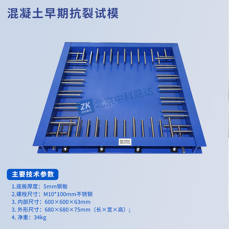 混凝土早期抗裂試模采用平板法測定水泥混凝土的早期開裂敏感性,測試水泥混凝土在約束條件下的早期抗裂性能。底座采用鋼板,四邊采用槽鋼,螺栓采用不銹鋼材質,尺寸標準,拆裝方便。符合JTG3420-2020《公路工程水泥及水泥混凝土試驗規(guī)程》中T0573-2020水泥混凝土早期開裂敏感性試驗方法(平板法)和CCES 01-2004《混凝土結構耐久性設計與施工指南》的標準要求。
