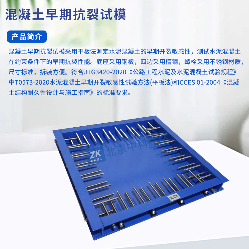 混凝土早期抗裂試模采用平板法測定水泥混凝土的早期開裂敏感性,測試水泥混凝土在約束條件下的早期抗裂性能。底座采用鋼板,四邊采用槽鋼,螺栓采用不銹鋼材質,尺寸標準,拆裝方便。符合JTG3420-2020《公路工程水泥及水泥混凝土試驗規(guī)程》中T0573-2020水泥混凝土早期開裂敏感性試驗方法(平板法)和CCES 01-2004《混凝土結構耐久性設計與施工指南》的標準要求。...
