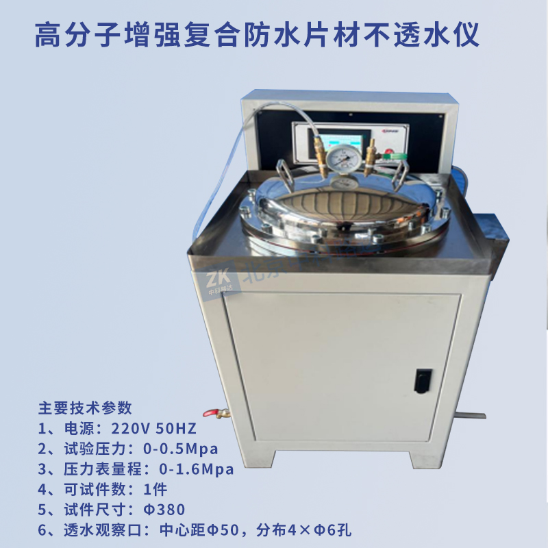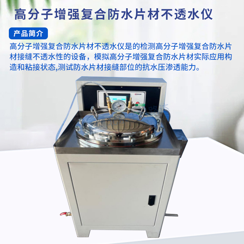 高分子增強復合防水片材不透水儀是的檢測高分子增強復合防水片材接縫不透水性的設備,模擬高分子增強復合防水片材實際應用構造和粘接狀態(tài),測試防水片材接縫部位的抗水壓滲透能力。本產(chǎn)品采用電動水泵加壓,具有自動保持壓力、自動計時等功能。符合GB/T26518-2023《高分子增強復合防水片材》的標準要求。