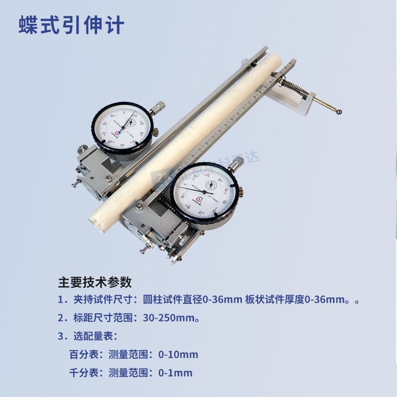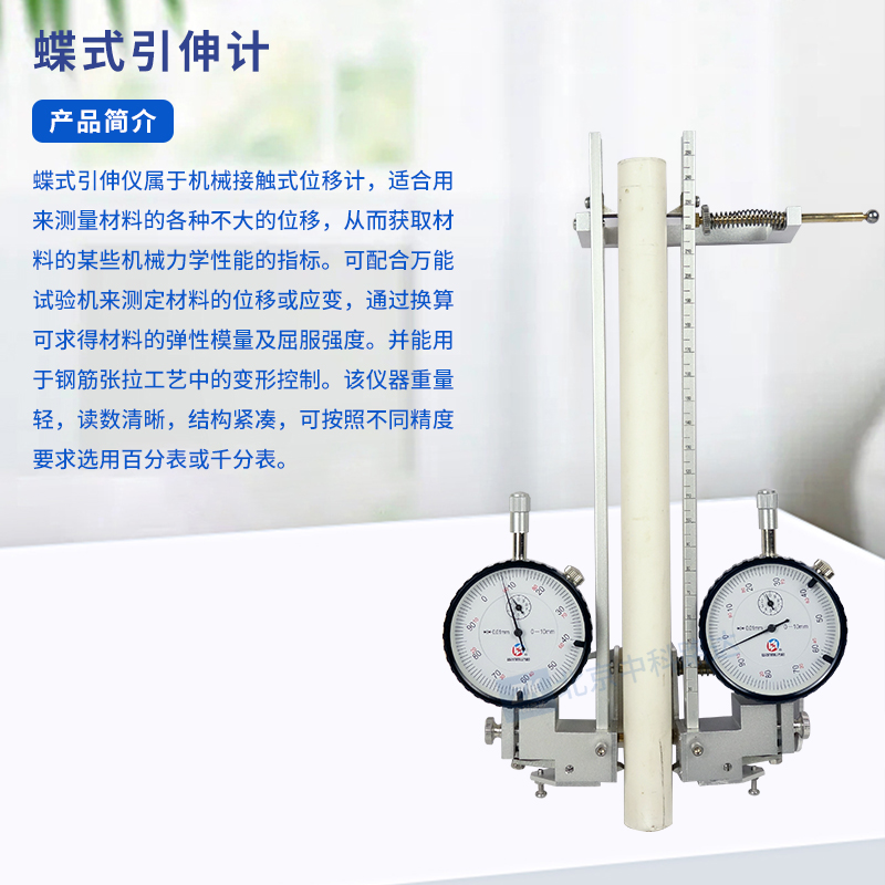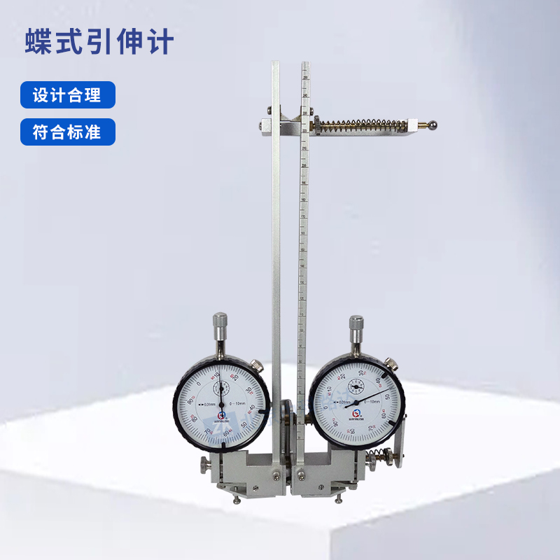 蝶式引伸儀屬于機(jī)械接觸式位移計(jì),適合用來測(cè)量材料的各種不大的位移,從而獲取材料的某些機(jī)械力學(xué)性能的指標(biāo)??膳浜先f能試驗(yàn)機(jī)來測(cè)定材料的位移或應(yīng)變,通過換算可求得材料的彈性模量及屈服強(qiáng)度。并能用于鋼筋張拉工藝中的變形控制。該儀器重量輕,讀數(shù)清晰,結(jié)構(gòu)緊湊,可按照不同精度要求選用百分表或千分表。