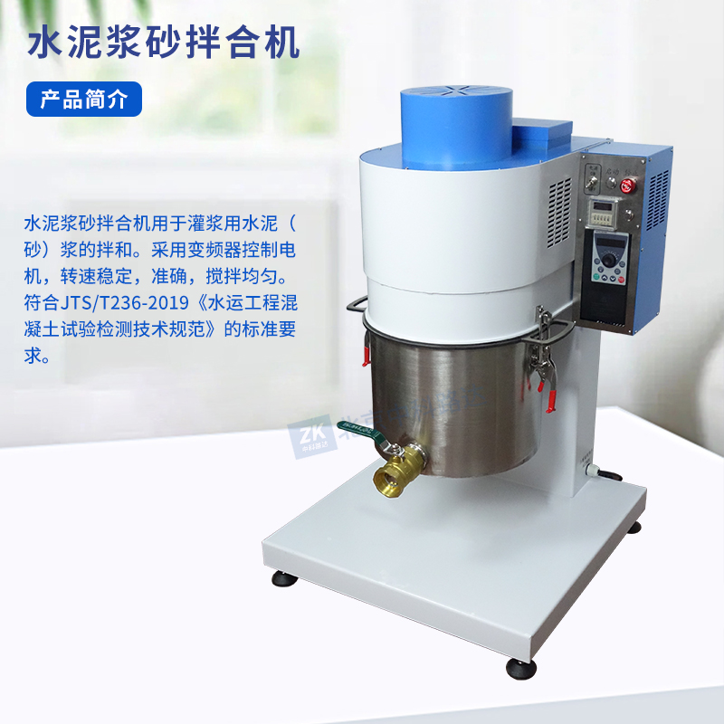 水泥漿砂拌合機用于灌漿用水泥(砂)漿的拌和。采用變頻器控制電機,轉速穩(wěn)定,準確,攪拌均勻。符合JTS/T236-2019《水運工程混凝土試驗檢測技術規(guī)范》的標準要求。