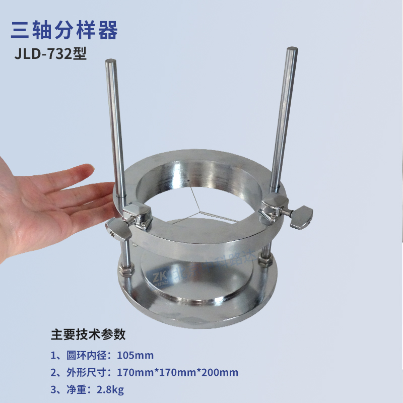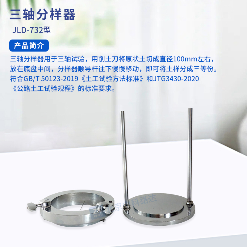 一、產(chǎn)品簡介三軸分樣器用于三軸試驗,用削土刀將原狀土切成直徑100mm左右,放在底盤中間,分樣器順導(dǎo)桿往下慢慢移動,即可將土樣分成三等份。符合GB/T 50123-2019《土工試驗方法標(biāo)準(zhǔn)》和JTG3430-2020《公路土工試驗規(guī)程》的標(biāo)準(zhǔn)要求。...