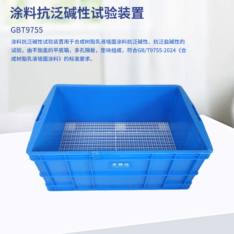 涂料抗泛堿性試驗(yàn)裝置用于合成樹脂乳液墻面涂料抗泛堿性、抗泛鹽堿性的試驗(yàn),由不加蓋的平底箱,多孔隔板,墊塊組成,符合GB/T9755-2024《合成樹脂乳液墻面涂料》的標(biāo)準(zhǔn)要求。
